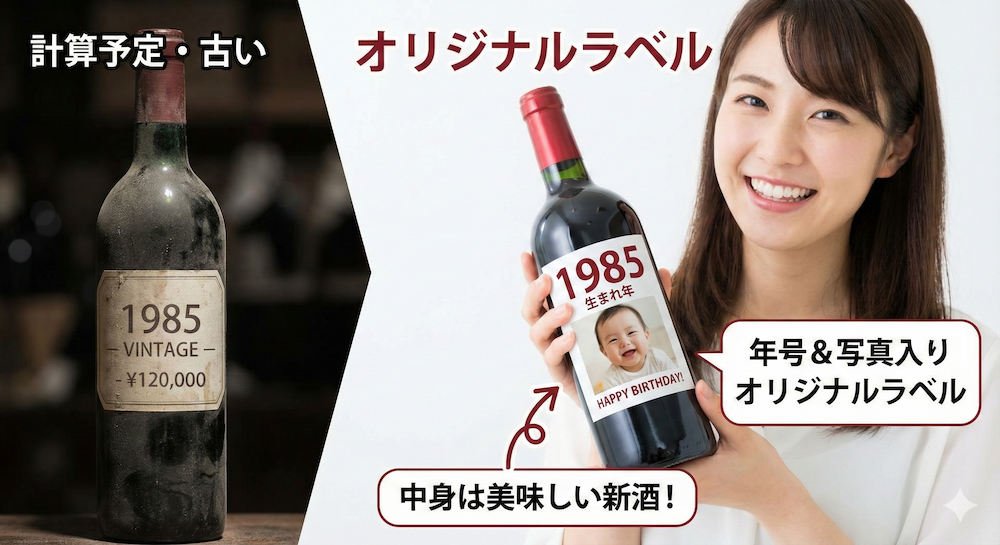 「生まれ年」にこだわりたいけれど、予算や味の不安が拭えない。それなら、中身は美味しくて新しいワインを選び、ラベルに大きく年号を入れるのはいかがでしょうか?