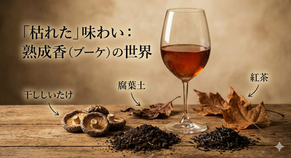 長い熟成を経ることで、干ししいたけ、腐葉土、紅茶のような、落ち着いた「熟成香(ブーケ)」が生まれます。