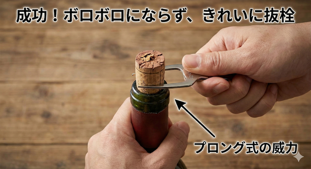 2枚の刃でコルクを挟んで引き上げる「プロング式(二枚刃式)オープナー」を使うのが最も安全です。