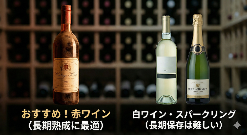 - 赤ワイン:タンニン(渋み成分)が酸化を防ぐため、長期熟成に最も適しています。