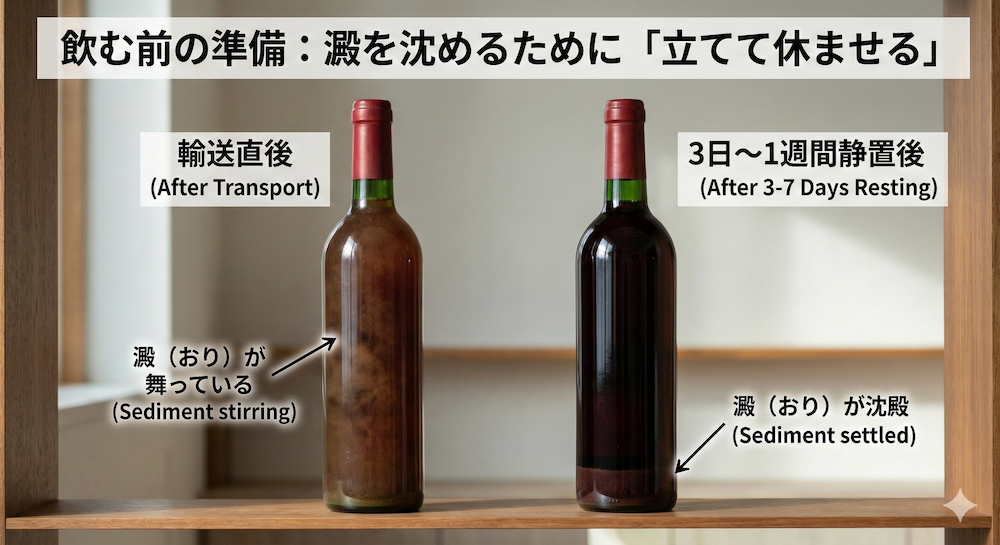 飲む前の準備:澱(おり)を沈めるために「立てて休ませる」