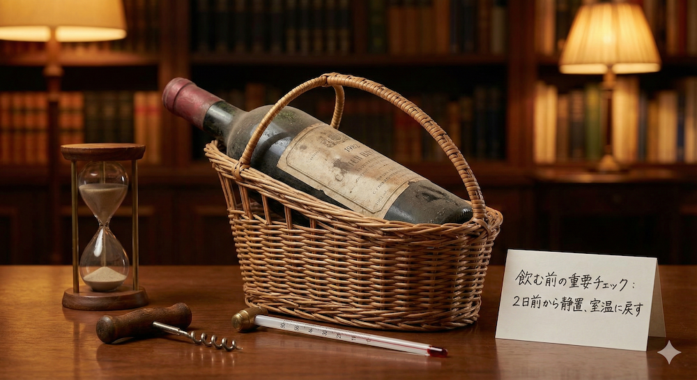 ここが最も重要なポイントです。ヴィンテージワインは、買ってすぐ開けて飲むと失敗することがあります。贈る相手にも、以下の注意点を必ず伝えてあげてください。
