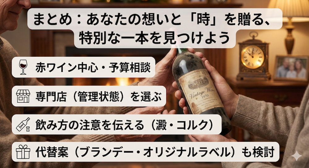 グラスを傾けながらそんな会話が生まれることこそが、ヴィンテージワインを贈る最大の価値です。味の好みを超えた「ストーリー」を贈ることができる、世界で唯一無二のギフトと言えるでしょう。